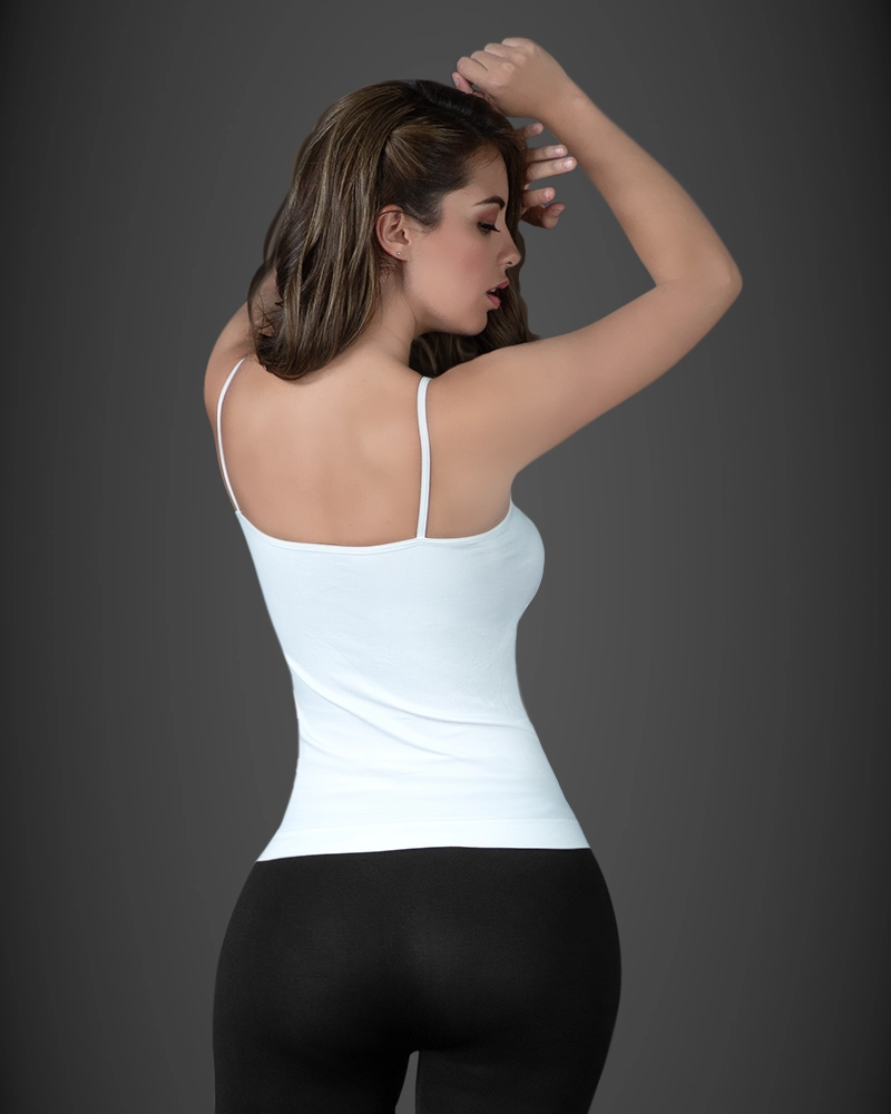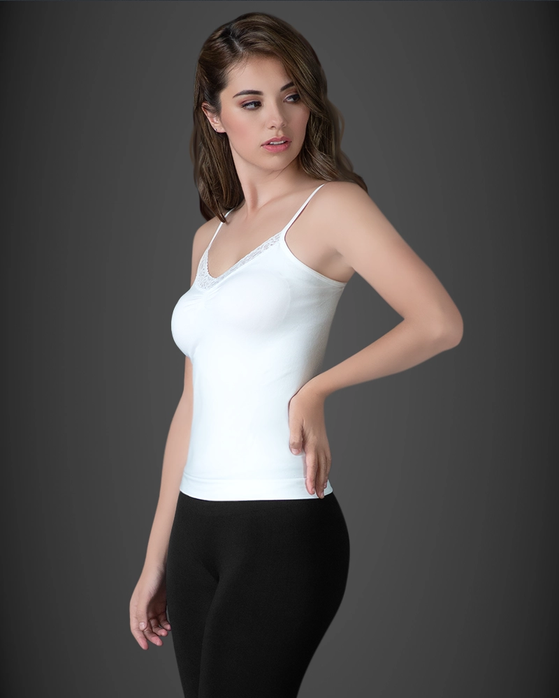 Camiseta para mujer con tirantes delgados y encaje en escote V, tejida en microfibra con minimas costuras que se ajustan a tu cuerpo.